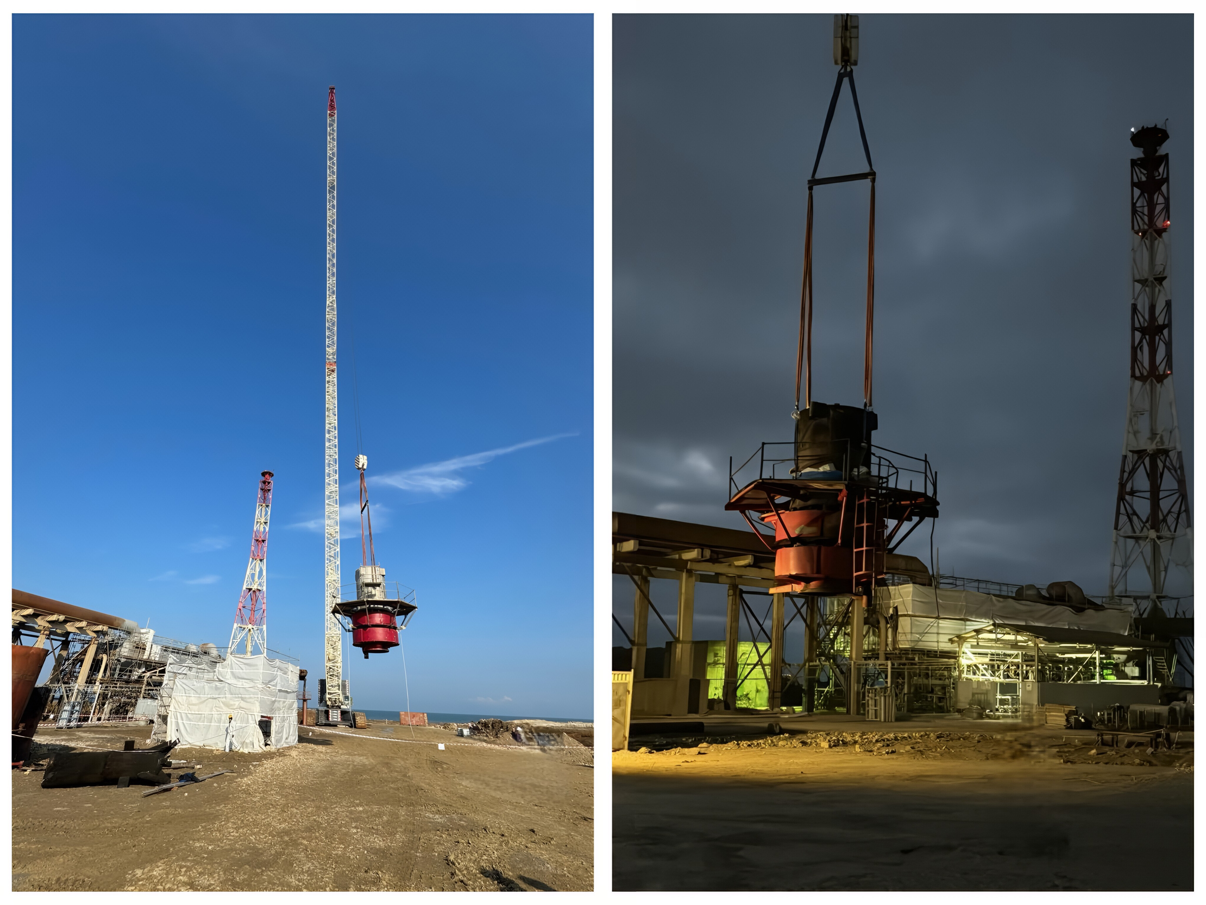 Layihə müddətində 22 ton çəkisi olan məşəl tac başlığının qaldırılması üçün 1200 ton qaldırma gücünə malik xüsusi kran istifadə olunmuşdur. Qeyd edilən kranın ərazidə mobilizasiyası üçün 4500 m2 torpaq sahəsi qazılaraq yeni subbase materialı ilə əvəz edilmiş, yükgötürmə (plate load test) və sıxlıq testi (qum konusu) tərəfimizdən yerinə yetirilmişdir. Tac başlığı 120 metr hündürlükdən diqqətlə və təhlükəsiz şəkildə qaldırılmış, mühəndis və texniki heyətin peşəkar nəzarəti altında yerə endirilmişdir. Bu mərhələ yüksək riskli və diqqət tələb edən əməliyyat olduğundan, işçi təhlükəsizliyi və ətraf mühitin qorunması prioritet kimi qəbul edilmişdir. Qaldırma və yerləşdirmə əməliyyatları ən müasir texnologiyalar və avadanlıqlarla təmin edilmiş, heç bir avadanlıq üçün zərər və ya qəzaya yol verilməmişdir.